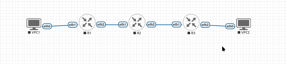 We'll use a 3-router chain with 2 PCs at the ends. This gives us enough complexity to test routing decisions, but its simple enough to set up.